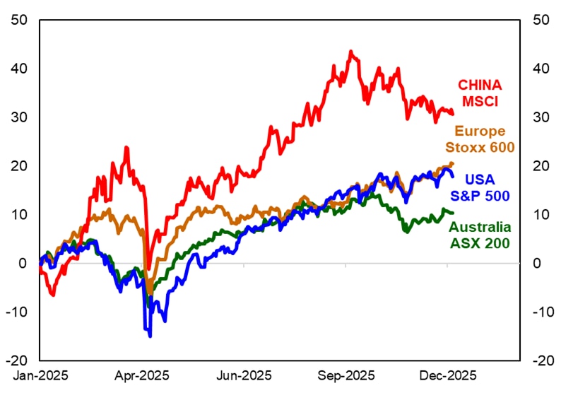 Enthusiasm for technology has been the key positive driver of 2025 returns for global shares. The largest AI chipmaker, NVIDIA, delivered a 39% annual price increase and ended the year as the world’s most valuable company. Korea’s Samsung Electronics 125% annual price gain, a 44% price surge for Taiwan Semiconductor and Europe’s ASML 36% gain display that the exuberance for technology is a global mania and not just a US fad.