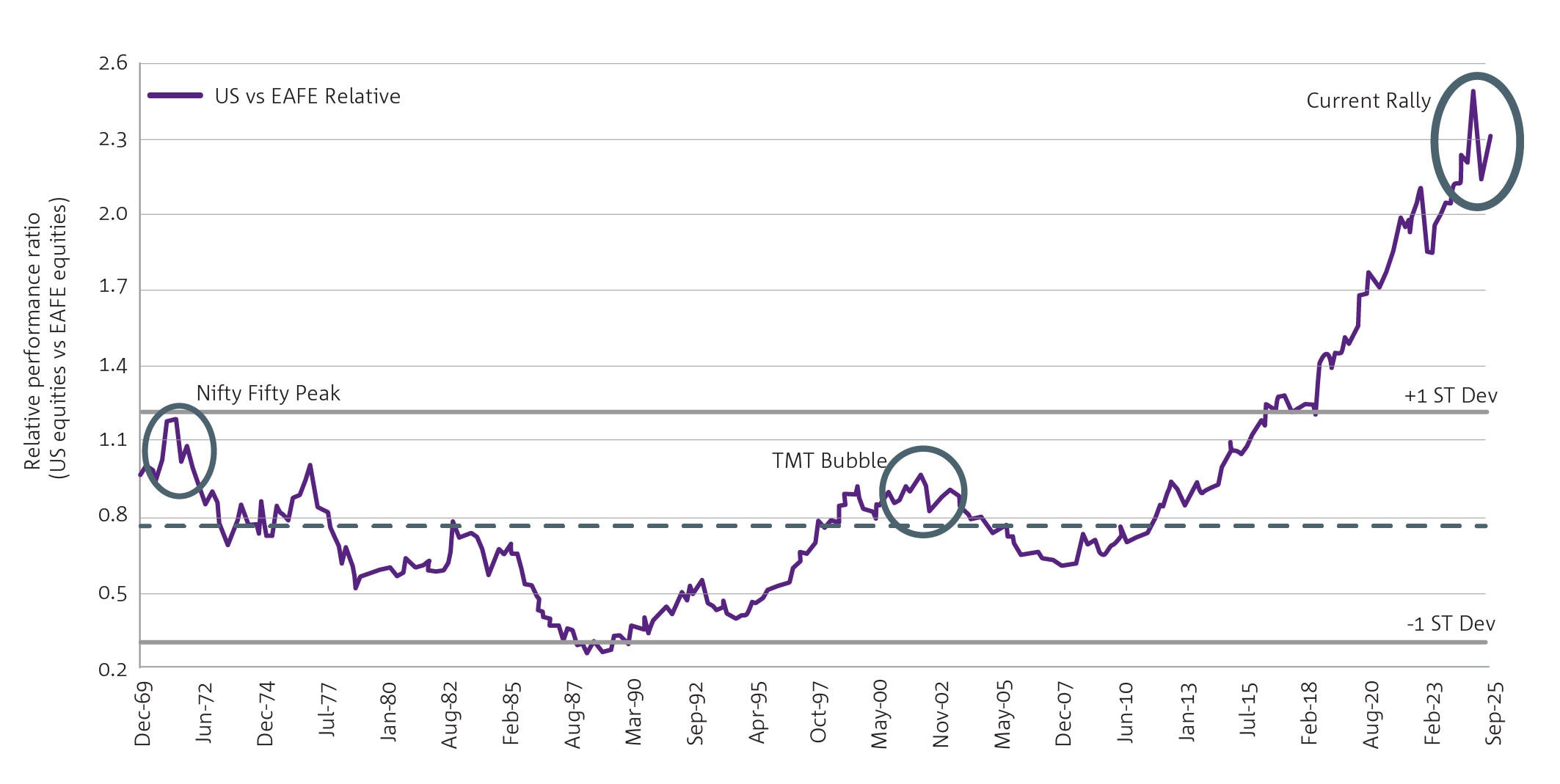 US market leadership vs rest of the world: 1970-September 2025