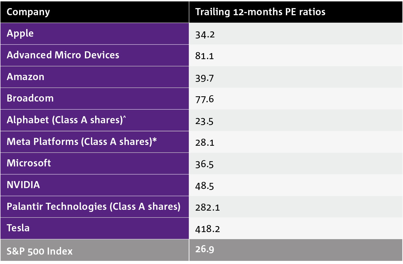 Here’s some data to help explain active managers’ reluctance not to be over-exposed to the US and its dominant stocks. The S&P 500 Index’s 26.9x price-earnings (PE) ratio is above the five-year average of 20x and above the 10-year average of 18.8x,4 while most heavyweight technology stocks are trading at market premiums with Palantir and Tesla trading at eye-popping valuations (Chart 2).