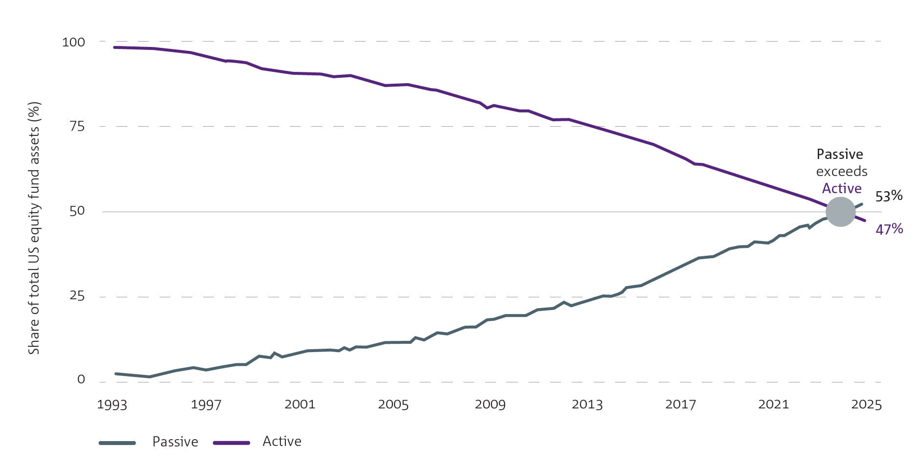 Chart 4: Passive investing now exceeds active investing in the US